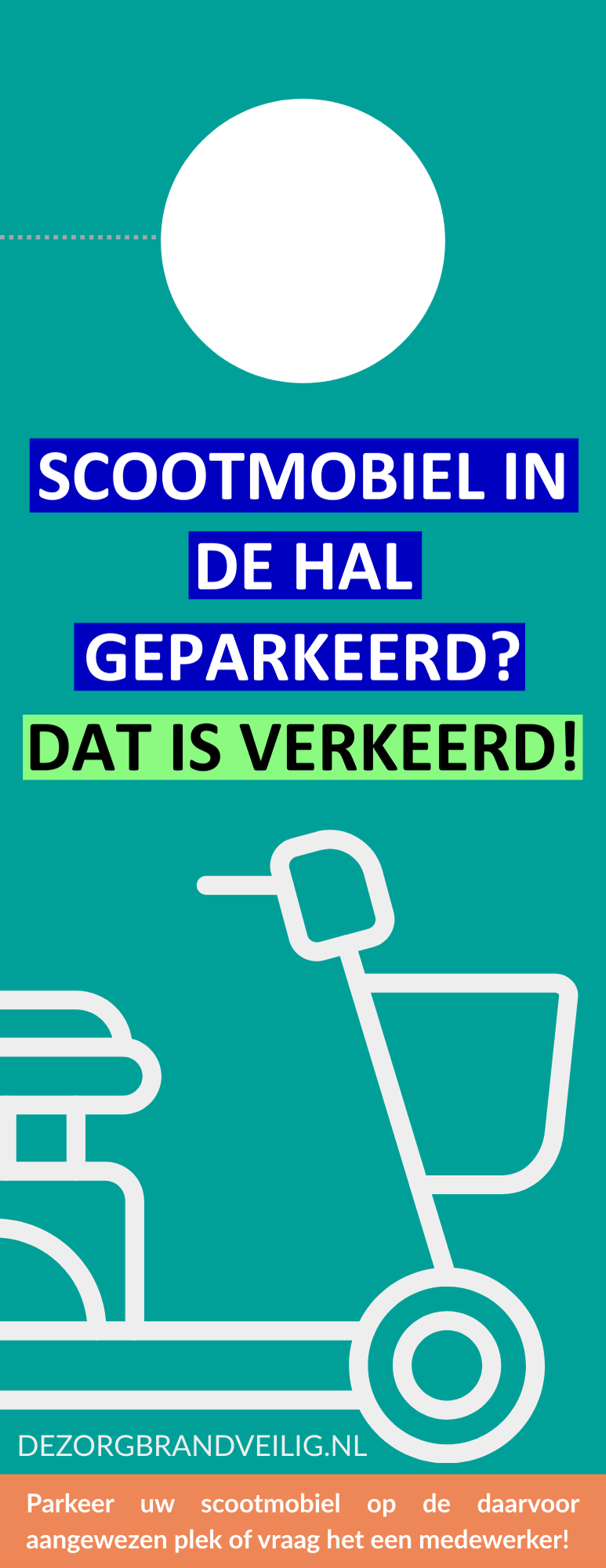 Vaak worden scootmobielen in vluchtroutes geparkeerd. Hoewel dit natuurlijk praktisch is, levert het risico’s op voor de brandveiligheid. Ook is het in veel gevallen niet toegestaan. Om hier op een duidelijke manier aandacht voor te vragen, bestaat er een deurhanger voor scootmobielen.